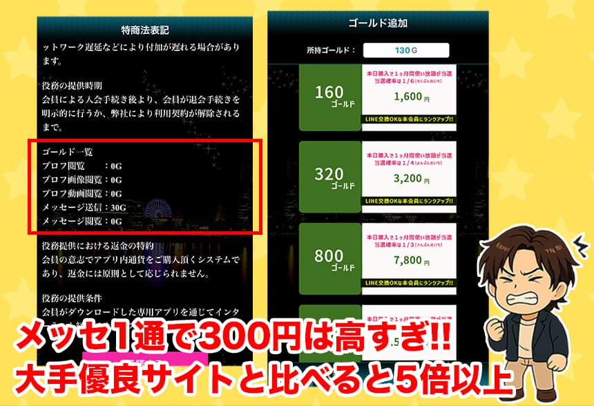 だけど、メッセージ送信が30G(ゴールド)だから、1通おくるたびに300円の消費ってことになる!