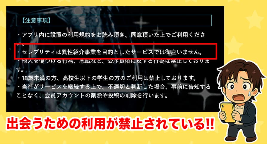 セレブリティ(Celebrity)の規約には「異性紹介事業を目的としたサービスでは御座いません」と書かれており、出会いトラブルが起きてもすべて自己責任となってしまうので気をつけてくれ!