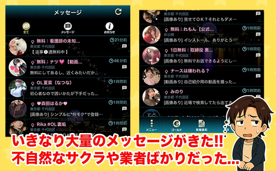 1. サクラからの大量メッセージや高額課金だけが狙いの危険性あり!