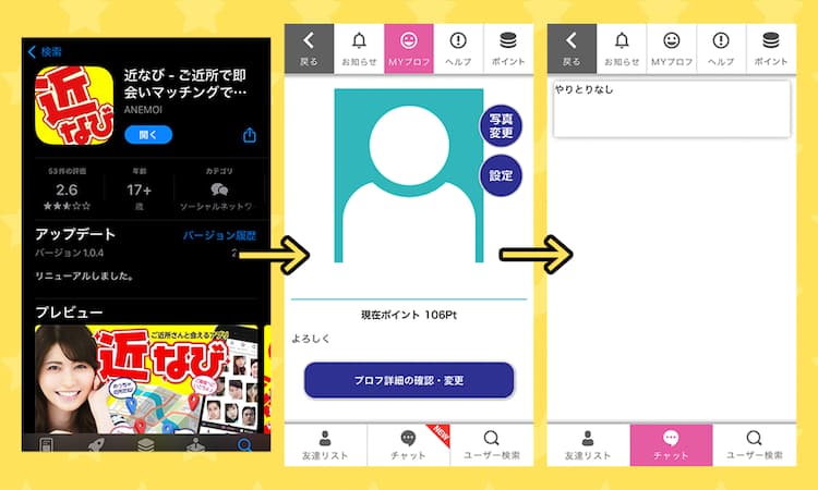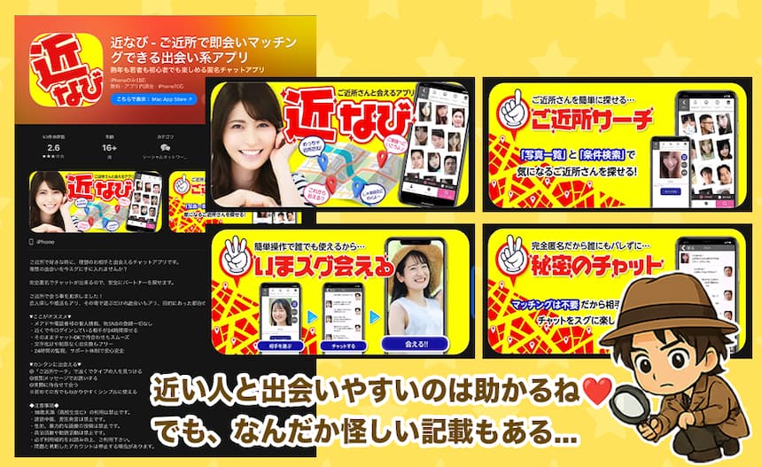 近なびのアプリって、名前だけ見ると近所でサクッと出会えそうに思えるよな。