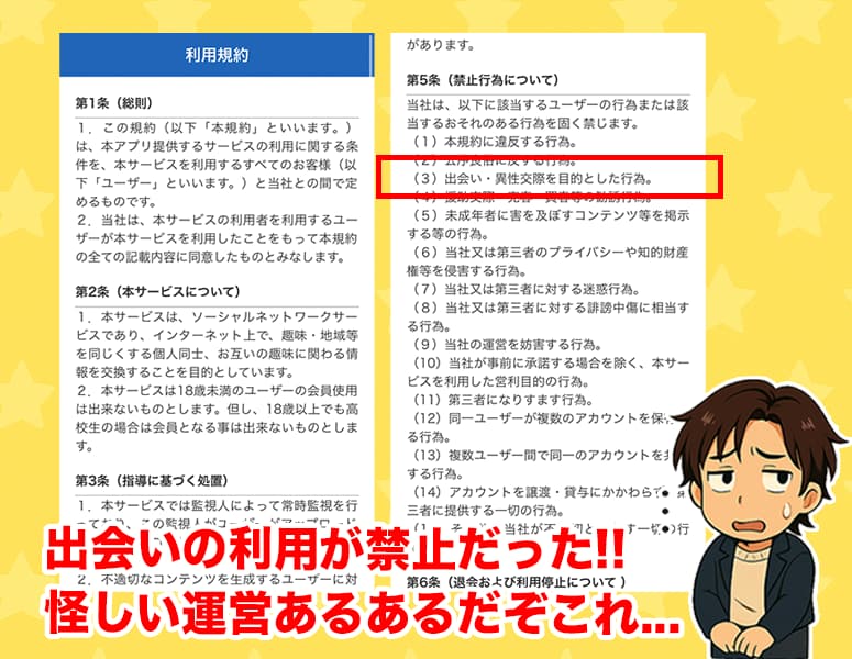まず一番ヤバいのは、利用規約に出会い目的が禁止って書いてある点だね。