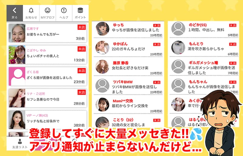 2. 登録直後から大量メッセージでサクラや業者が多すぎ!