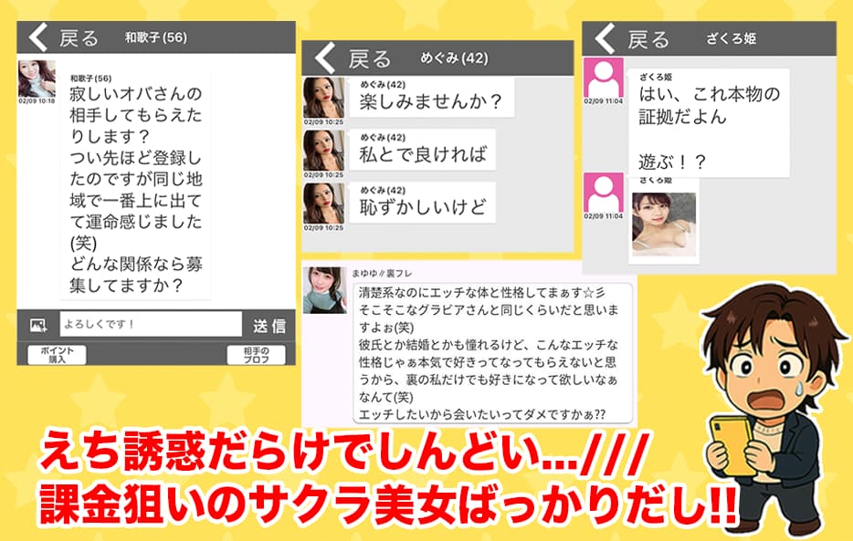 しかも怪しいサクラ運営の可能性があるから、サクラや業者との会話で引き伸ばされて、課金地獄にハメられる危険性も多そうだね!