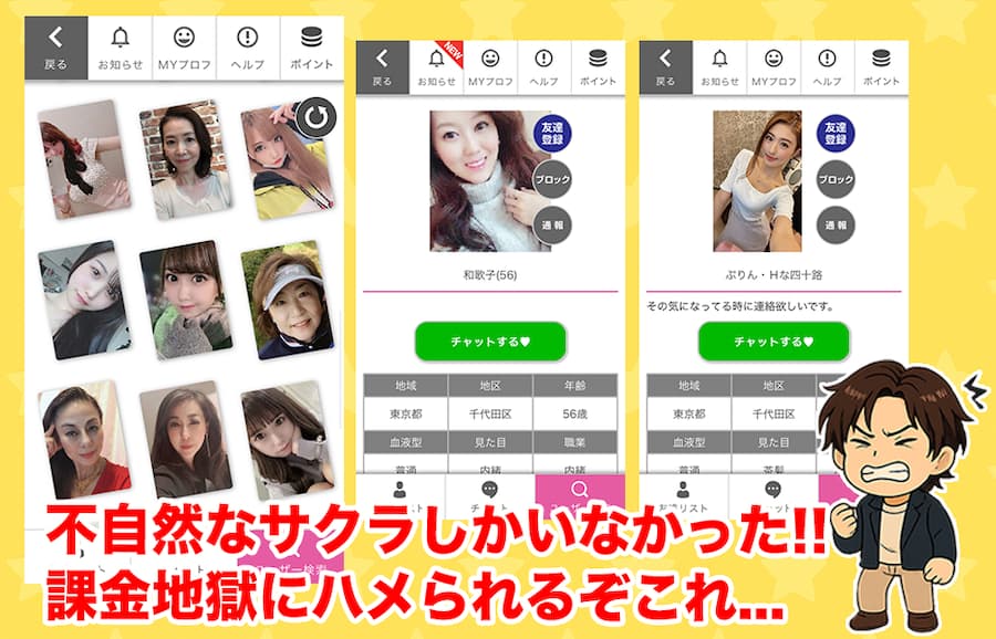 俺が登録検証した感じだと、会話が噛み合わない相手ばかりで出会える期待は薄いです。規約に出会い目的NGもあり、課金だけ進む流れに注意してください。