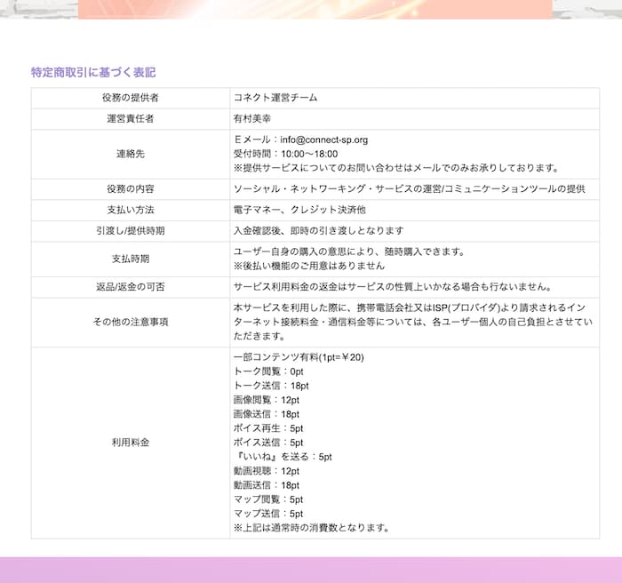 さらに、運営元の表記も「コネクト運営チーム」としかなく、住所や電話番号も不明で隠されている。