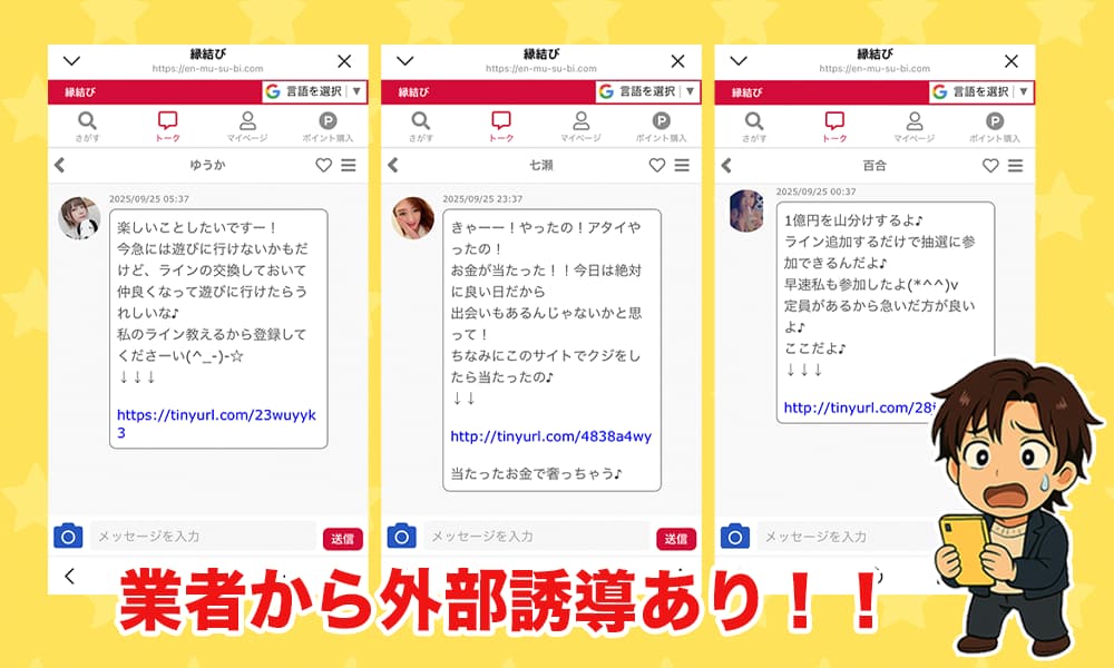 さらに、縁結びのユーザーからは、LINE交換を即求めてきたり、怪しい外部サイトのURLを送ってきて誘導する女性もいた。