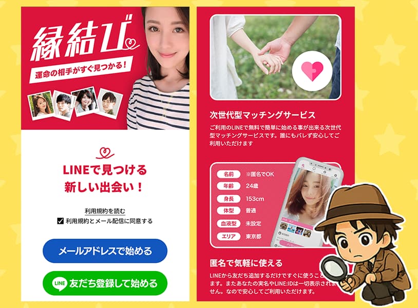 「縁結び」は株式会社ブラッシュアップが運営している出会い系アプリで、LINEログインかメールドレス登録だけで簡単に利用できる仕組みで、LINEで簡単に始められる次世代型マッチングサービスと言われているね。