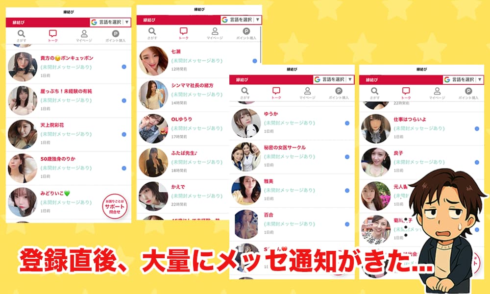 - 「登録直後から大量のメッセージ。内容が全部同じでサクラ確定だと思う」