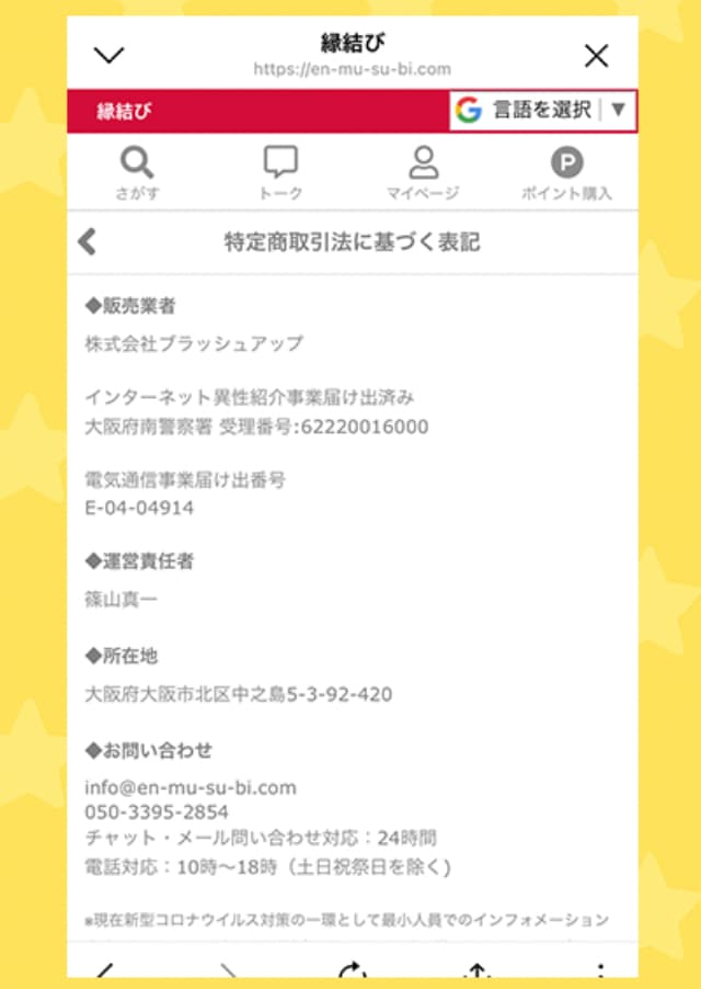 特定商取引法ページを確認したところ、インターネット異性紹介事業届出番号:62220016000の記載があった。