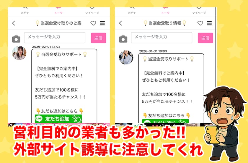 - 外部の悪質サイトやSNS誘導を狙う業者が紛れ込んでいる