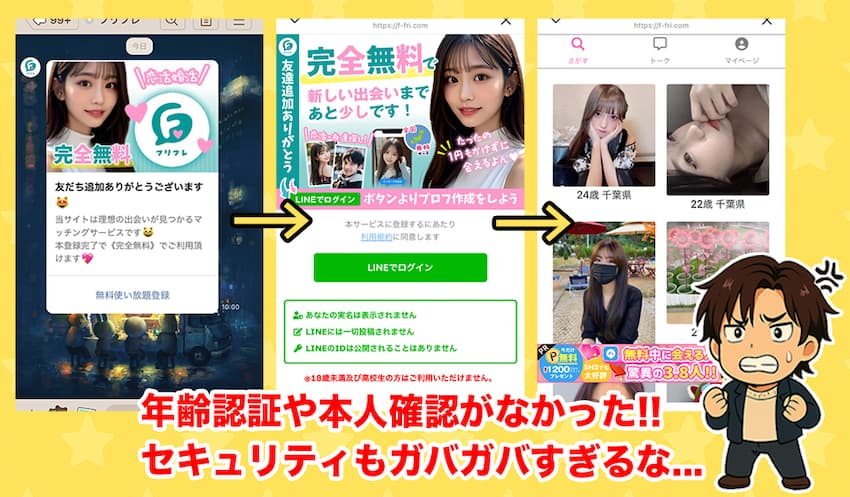 フリフレは、登録時点で年齢認証や本人確認が見当たらなかった。