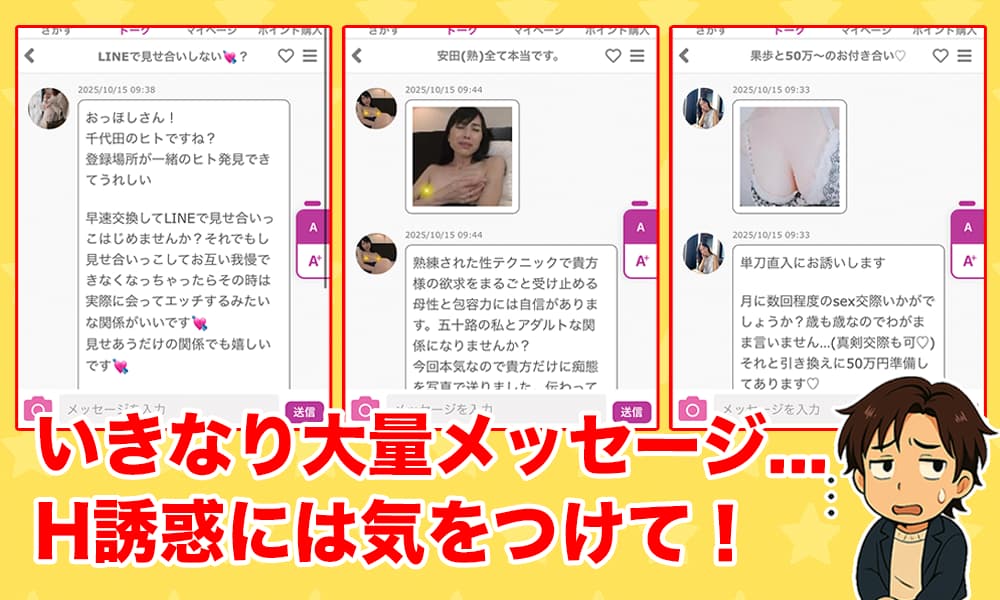 画面を見ると、いきなり3人の女性から「会える人ですか?🩷」「見せ合うだけの関係でもいい🩷」みたいなお誘いメッセージだらけ。