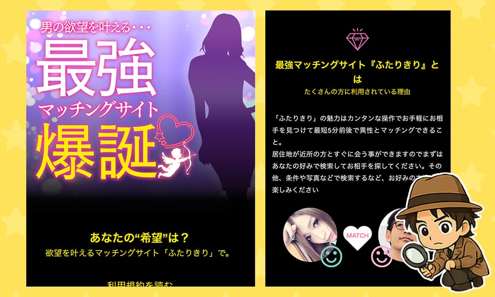 「ふたりきり」は、株式会社HTJが運営する出会い系マッチングサイトで、「男の欲望を叶える最強マッチングサイト」といった刺激的なキャッチコピーを掲げているサイトだね。