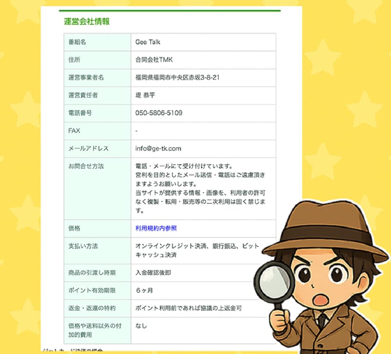 運営会社としては「合同会社TMK」が運営していて、責任者名や住所、電話番号もちゃんと書かれているね。