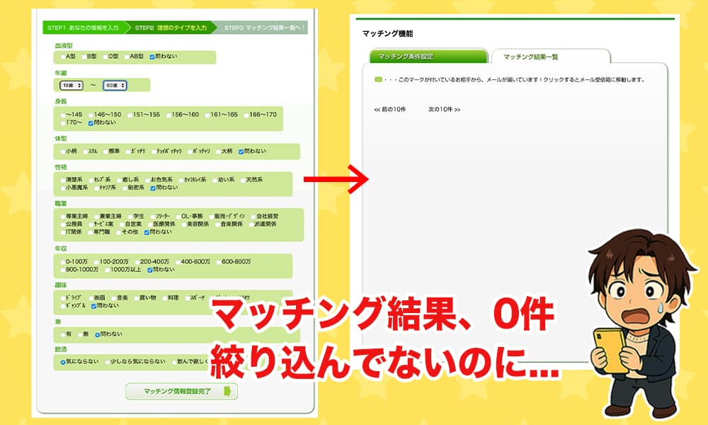 自分の年齢や性格などを入力した後、マッチング相手の情報を入れれば、絞り込んだ検索ができるって機能なんだけど、絞り込みなしでやってみるとヒット件数は0件だった。