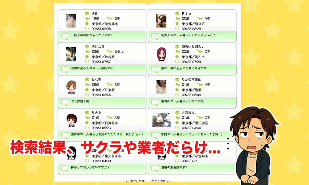 - サクラや業者ばかりで、リアルな出会いは期待できない