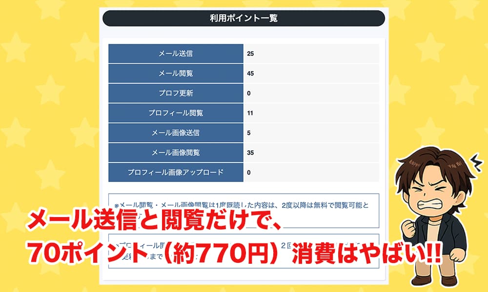 1回のメール送信とメール閲覧だけで70ポイント(770円)が消えていく仕組みになっていて、長く続けるほどかなり高額になるね💦