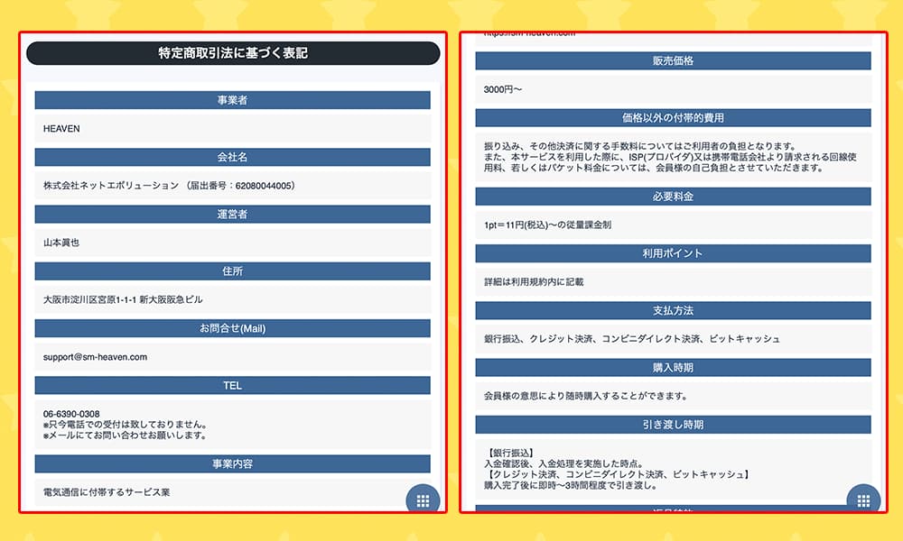 特定商取引法の表記はあり、確認すると法人名は「株式会社ネットエボリューション」、住所や電話番号、責任者名の記載もあった。