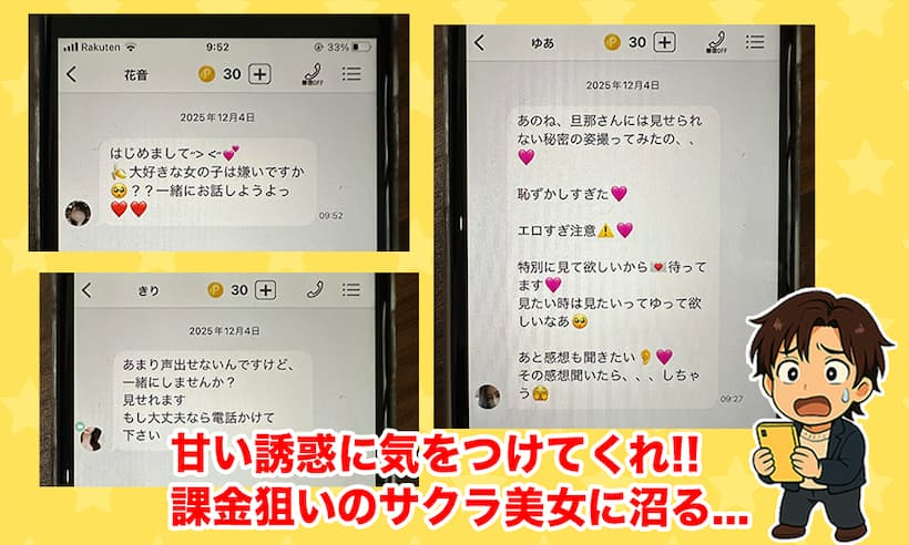 「私の写真を見てほしい💕」「えろすぎ注意だよ!❤️」「電話したいです...//」など、明らかに課金をさせるための罠ばかり!