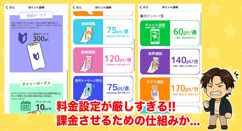 それに、閲覧や再生など相手から送られてきたものに対してのアクションで、ポイント消費される項目が多いのも怪しいポイントだな。