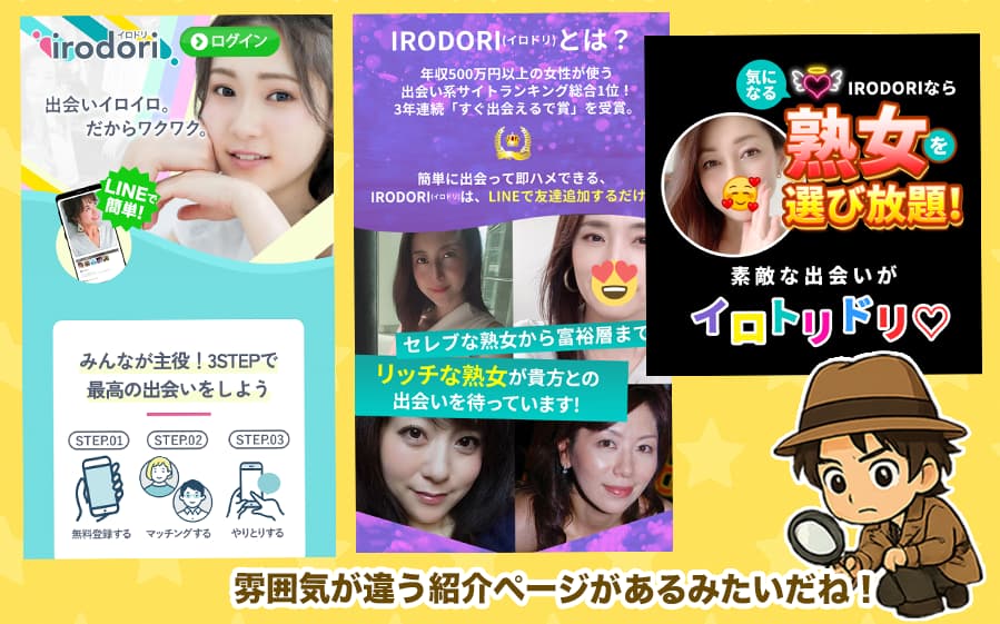 紹介ページを見ると、きれい系で安心感を出してるLPもあれば、熟女や即会いを強調したエロ路線の紹介あって、正直どっちやねんって思う!(^^;;