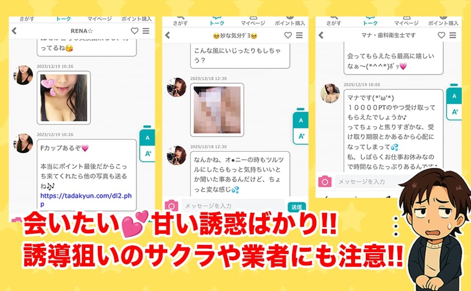サクラとのやり取りで課金が膨らみ、泣き寝入りになるケースが多いから気をつけてくれ!