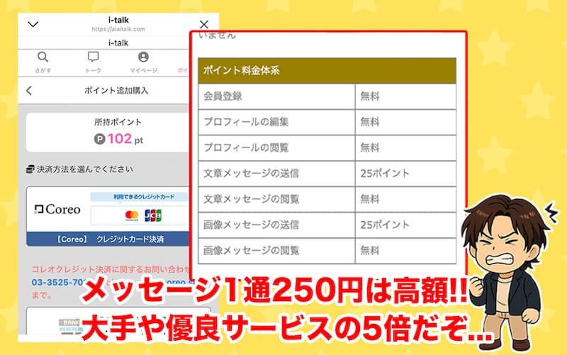 この時点で、アイトーク(i-talk)は出会う場所ではなく、課金させるために仕組まれている危険があったから、正直言うと利用価値なしの出会える風サイトです。