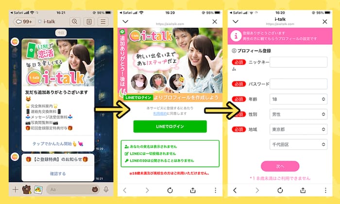 アイトーク(i-talk)は、LINEを使って異性とやり取りできると紹介されている、いわゆるLINE出会い系サービスだね。