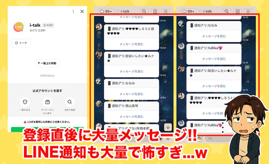 - 登録直後から不自然な大量メッセージが届くばかり