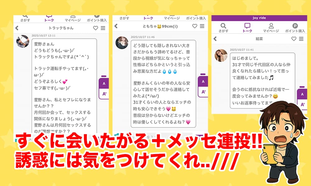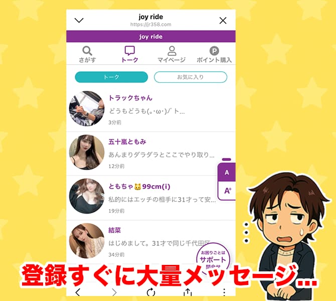 ジョイライド(JOY RIDE)は、登録直後の大量メッセージ、美人アカウントの乱立、噛み合わない滅エージのやりとり、外部の業者アカウントが紛れている、サクラや業者だらけの危険サイトの可能性が高い。