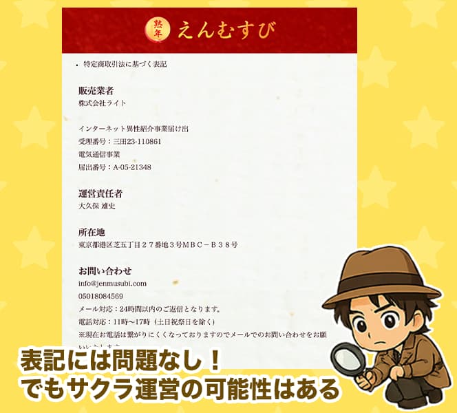 特定商取引法のページを確認したところ、熟年えんむすびは以下の情報を公開していた。