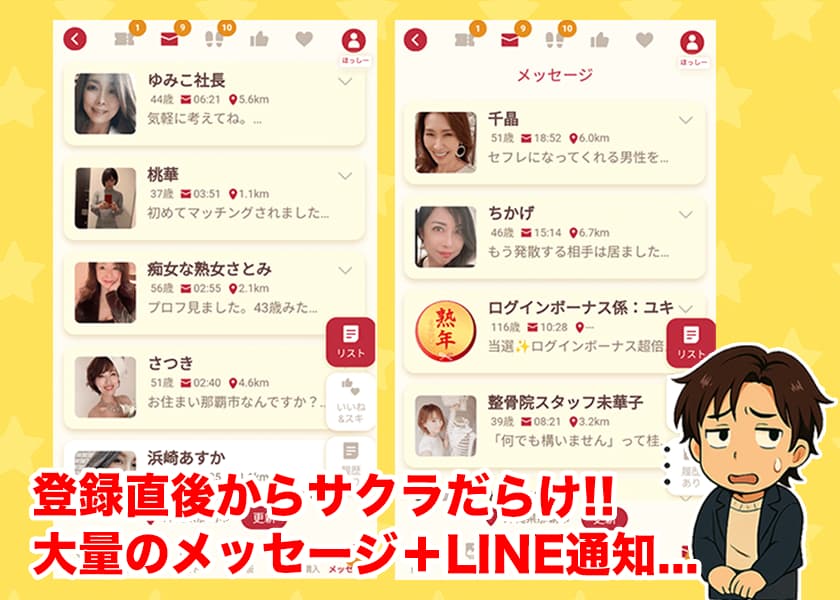 相談も来たから俺も熟年えんむすびを使ってみたけど、秒速で美女から大量メッセージが来て焦ったな!💦
