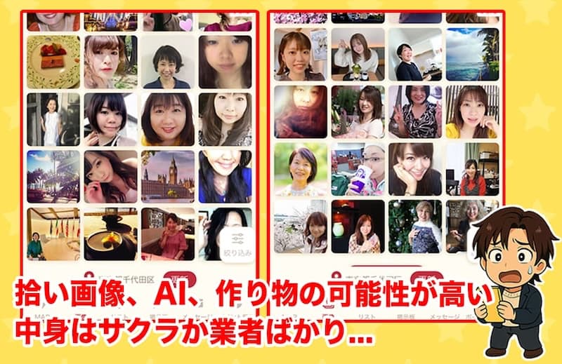 サクラの疑い、メッセージの不自然さ、高額課金の構造など、実際の挙動を総合的に見ないと危険を避けられません。
