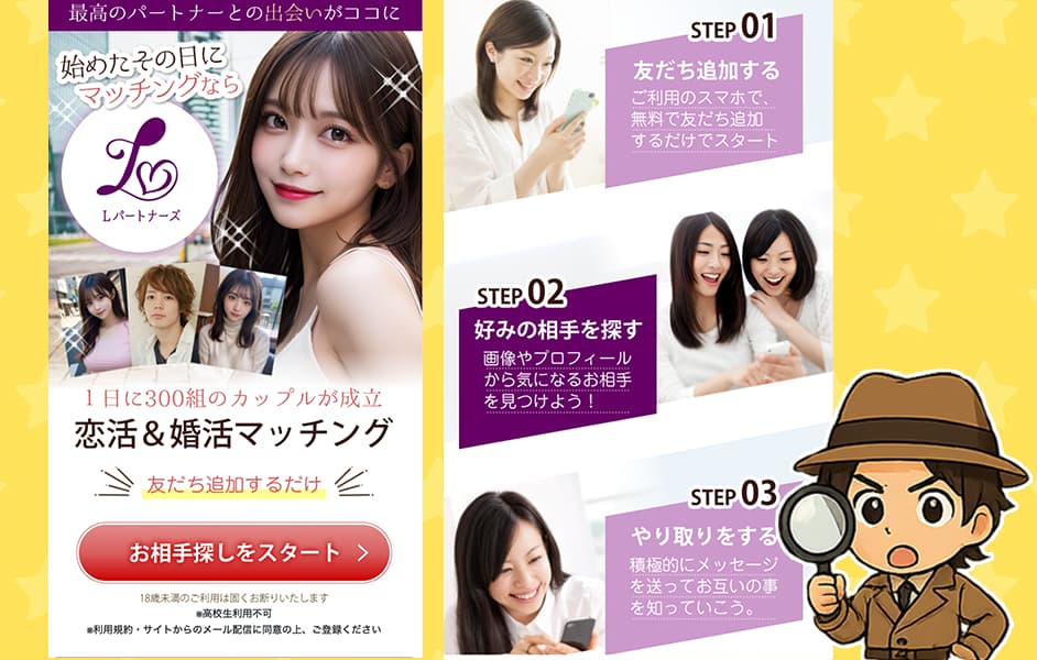 Lパートナーズも「1日300組がカップル成立」とか「簡単にすぐ出会える」なんて宣伝してるけど、ほんとに安心して使えるのかは疑問だよな。
