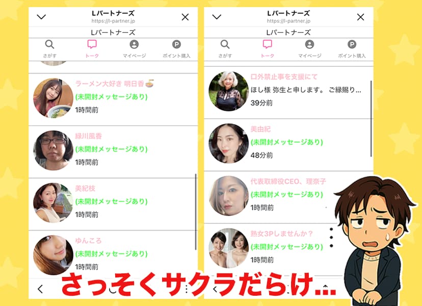Lパートナーズに登録直後から、こんなサクラや業者が大量に湧いてくるから気をつけてくれ!