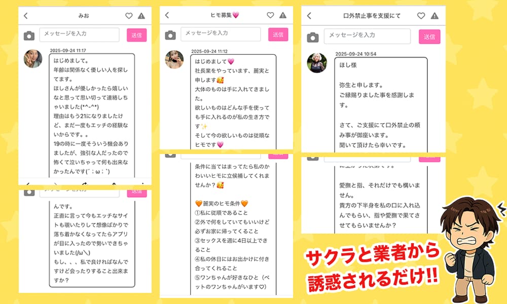 実際にメッセージを見て、やり取りもしてみたけど、「これから会えるかな♡」「私の紐になりませんか?💕」みたいなお誘いメッセージばかり。
