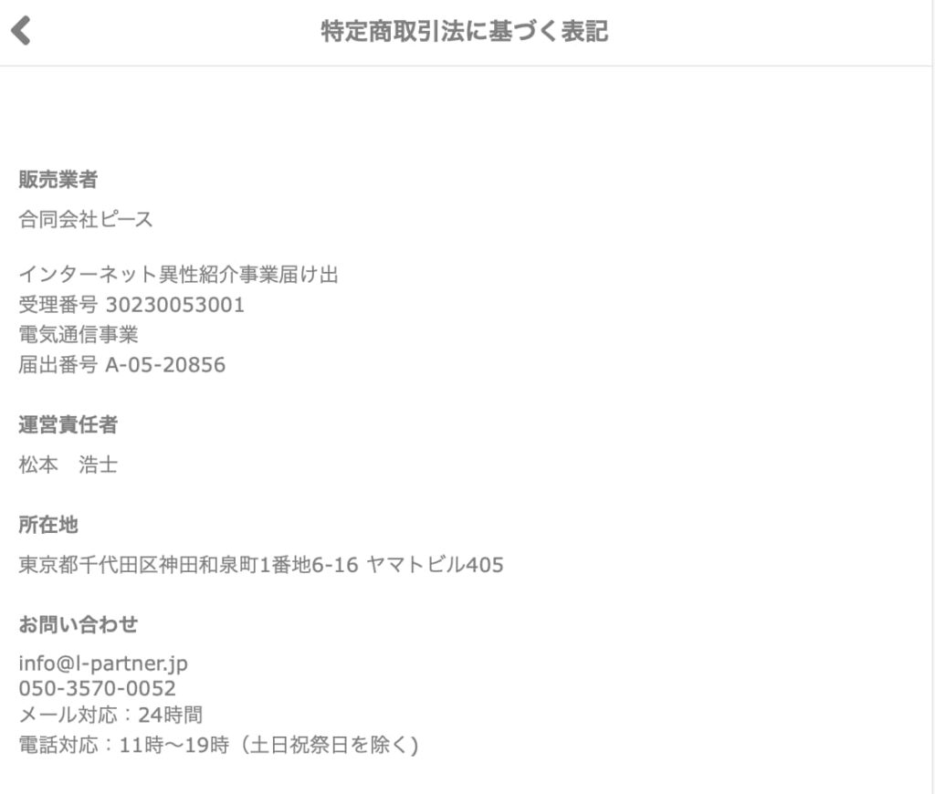 特定商取引法ページを確認したところ、インターネット異性紹介事業届出番号「30230053001」としっかり記載があった。