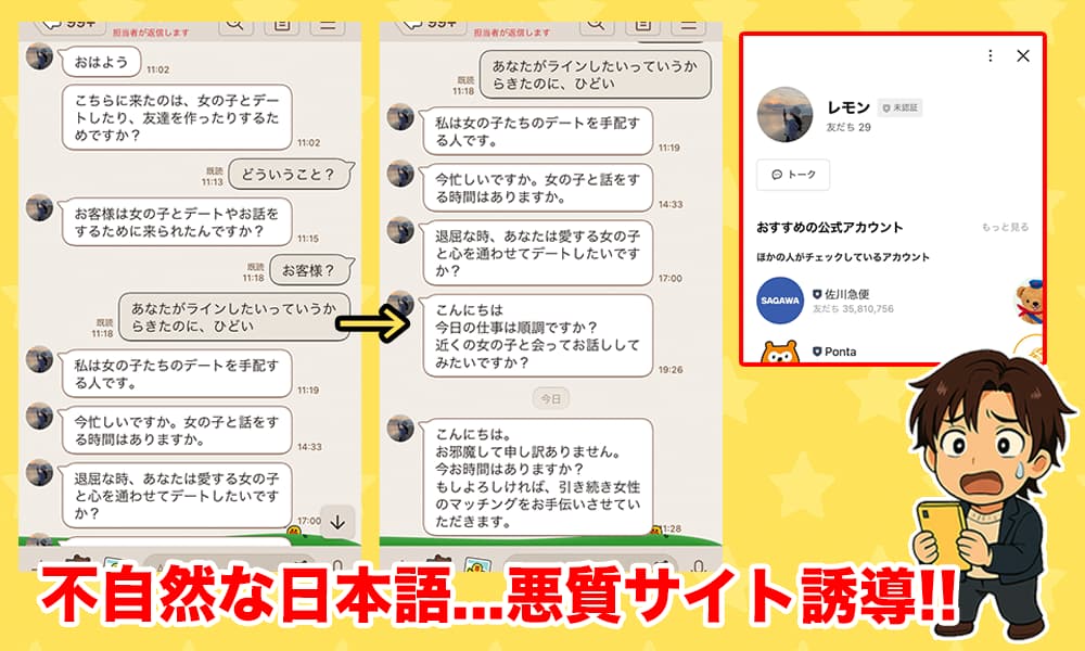 完全に外から拾ってきた画像だったり、実際にやりとりしてみると、不自然な日本語になってたりして海外っぽさも感じたよ。💦
