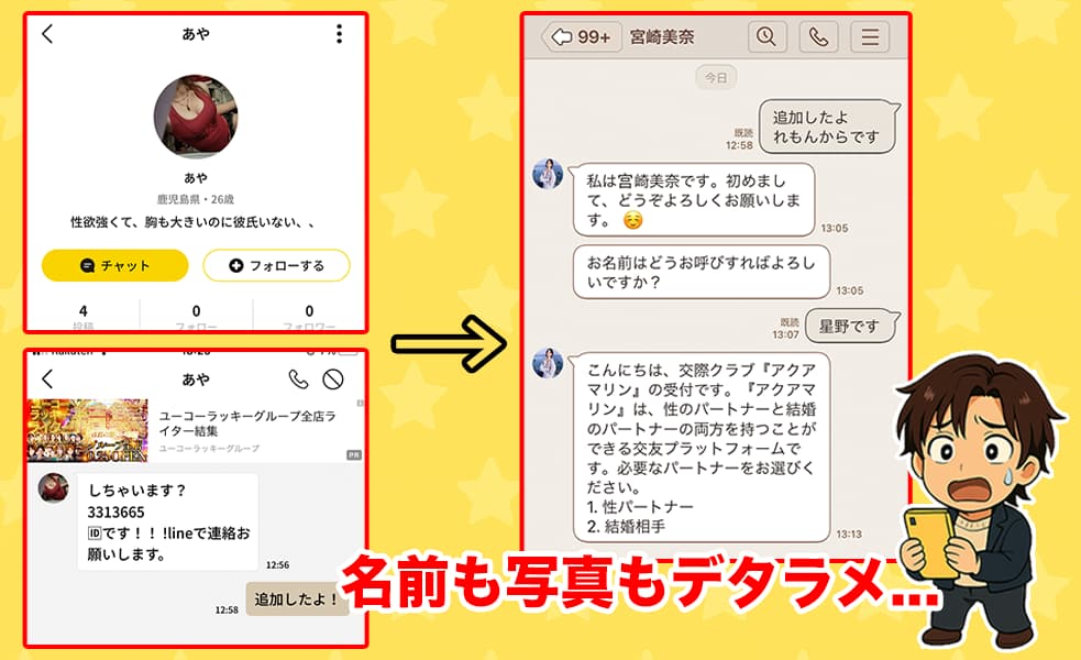 本人確認や年齢認証なしで使えるアプリは、未成年や業者が混ざるためリスクが非常に高い!安全管理体制が整っていない可能性もあるから注意が必要ってこと。