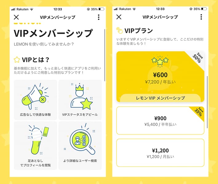 月1200円〜600円でVIP会員になれて、広告を消せたり足跡なしでプロフィールが見れたり、少し機能性が上がるようだな。