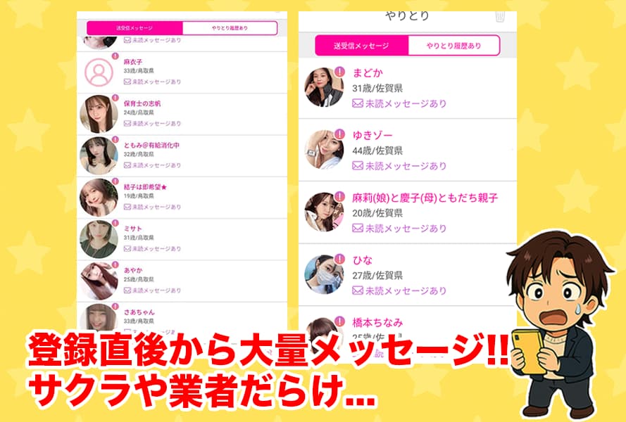 - 登録直後から大量メッセージが届くがサクラ女性や業者だらけ