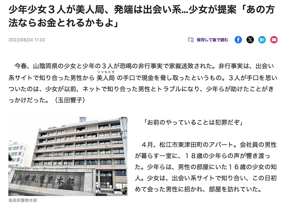 4月、松江市東津田町のアパート。会社員の男性が暮らす一室に、18歳の少年らの声が響き渡った。少年らは、男性の部屋にいた16歳の少女の知人。少女は、出会い系サイトで知り合い、この日初めて会った男性に招かれ、部屋を訪れていた。少女は部屋に入った後、男性に気づかれないよう、玄関の施錠を解除。事前の打ち合わせ通り、少年らは少女から受け取ったSNSのメッセージを合図に、一斉に部屋に上がり込んだ。