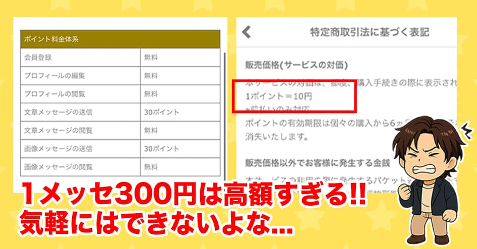 費用感はメッセージ送信や画像送信に30ポイント(300円)が必要で、かなり高額。💦