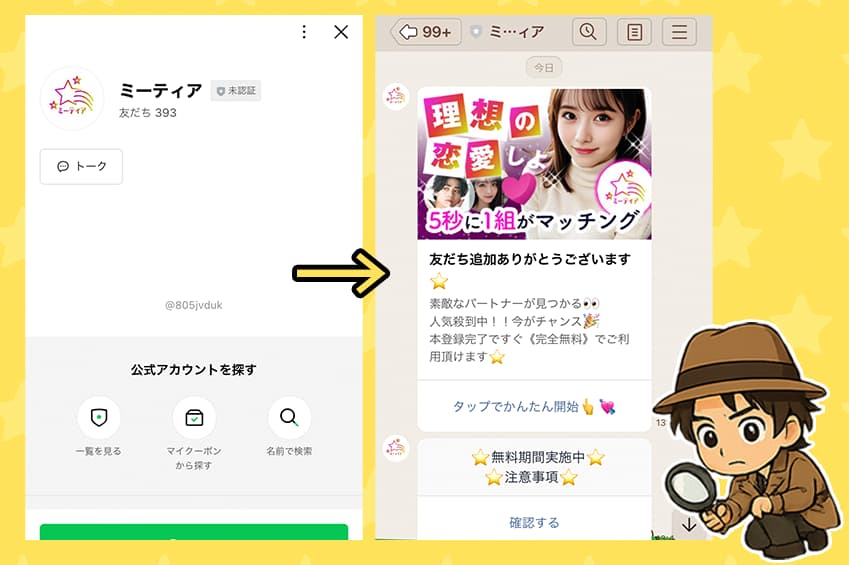 LINEを登録するだけで使える手軽さの裏には、サクラや外部サイト誘導の危険が隠れていたよ。