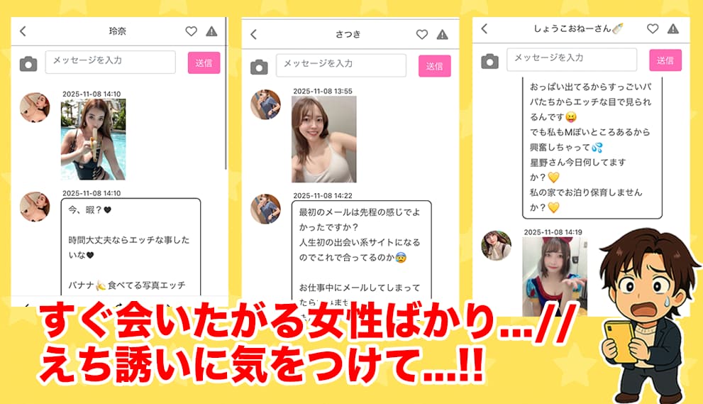 「えっちなことしたいな💕」「これから会えますか?」「家でお泊まり保育しませんか?💛」みたいな誘惑のメッセージが次々に届いた。