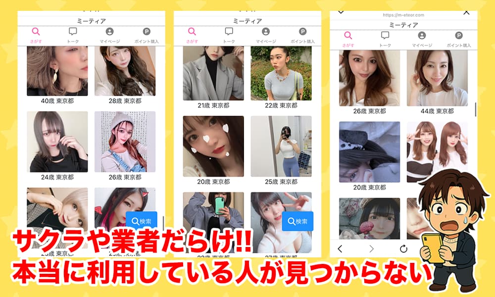 ちなみに、こちらから検索をかけて、ミーティアにリアルな利用者がいるのかも調べてみましたが、自然そうに見せかけたサクラや業者としかマッチングしなかったので、出会える可能性はゼロだと考えられます。