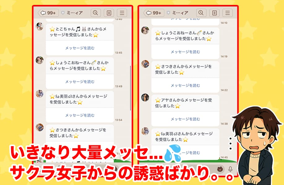 ここまで登録して感じたのは、サクラや業者からのメッセージ演出による高額課金や誘導が狙いの可能性が高かった。