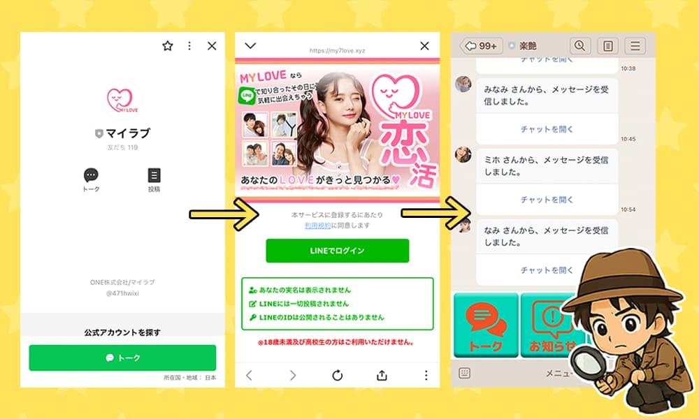 一見すると「LINEで恋が始まる」なんてワクワクするキャッチコピーだけど、実際に中身を見てみるとかなり危険な構造だったんだ。