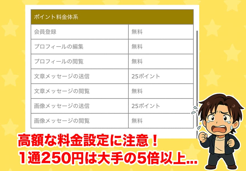 1ポイント10円のポイント課金制だから、1通あたり250円ってことになる。これはかなり高額だね…。
