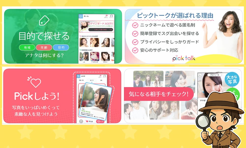 今回は「PickTalk(ピックトーク)」っていう出会い系アプリについて調査したよ。